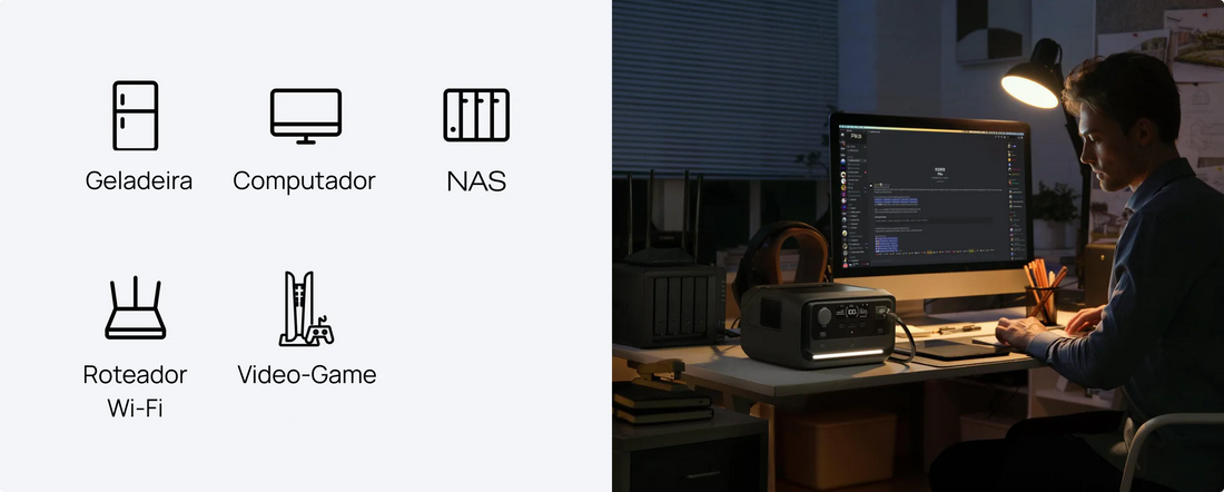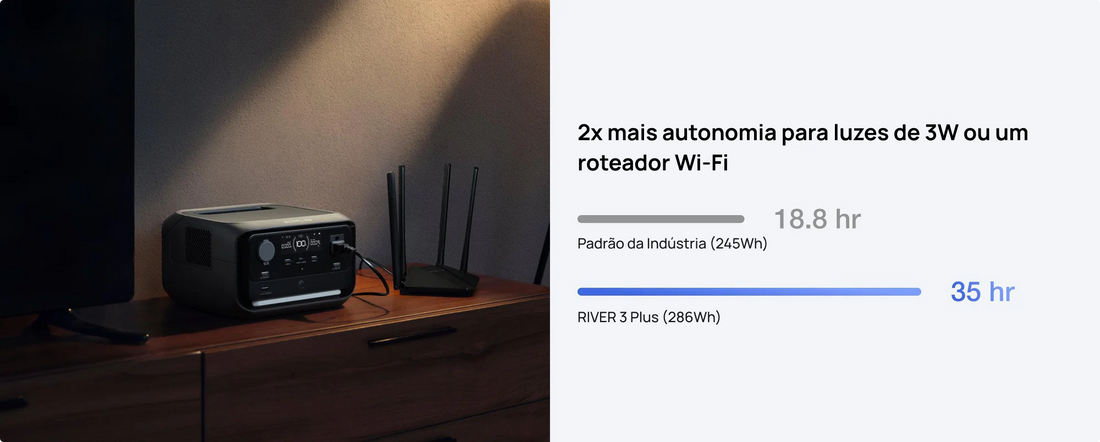 O RIVER 3 Plus se destaca no segmento de estações de energia compactas. Sua tecnologia X-Boost permite operar continuamente dispositivos de aquecimento de até 1200W sem dificuldades, mantendo 90% dos eletrodomésticos funcionando sem interrupções. Além disso, sua luz embutida garante que você nunca fique no escuro.